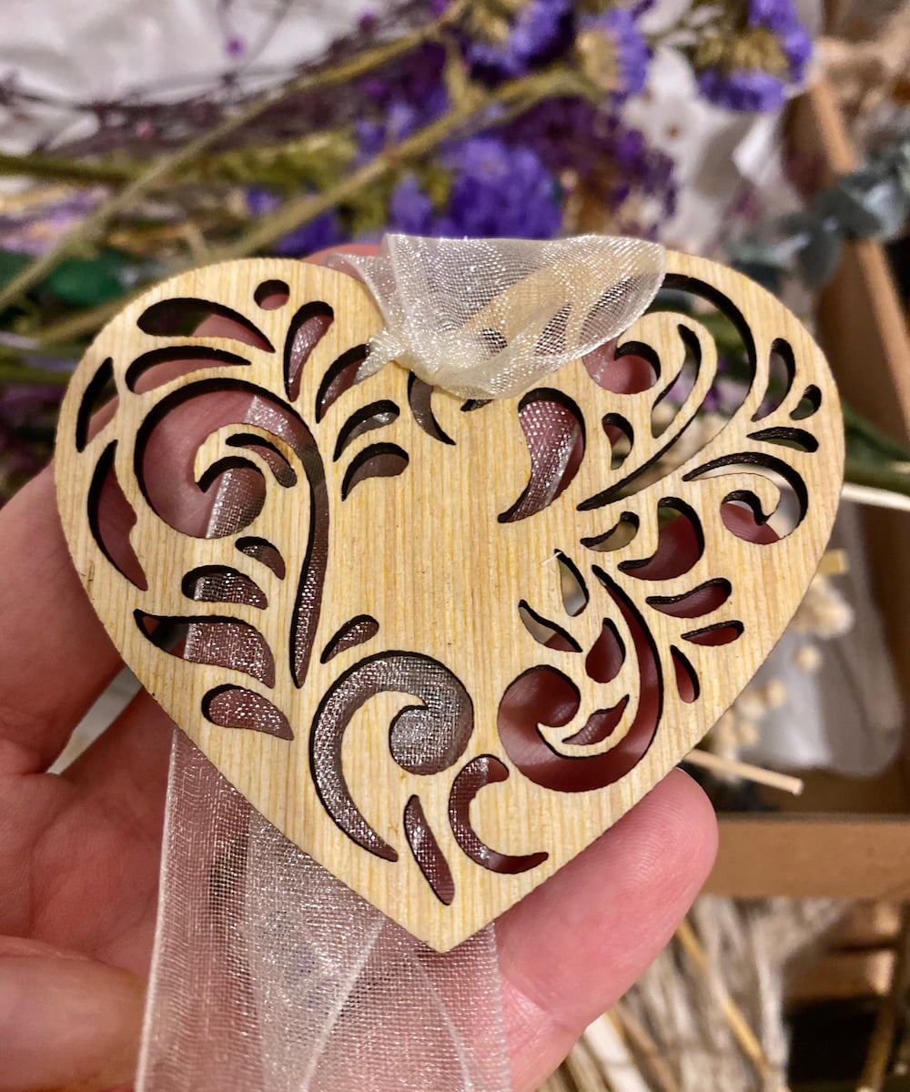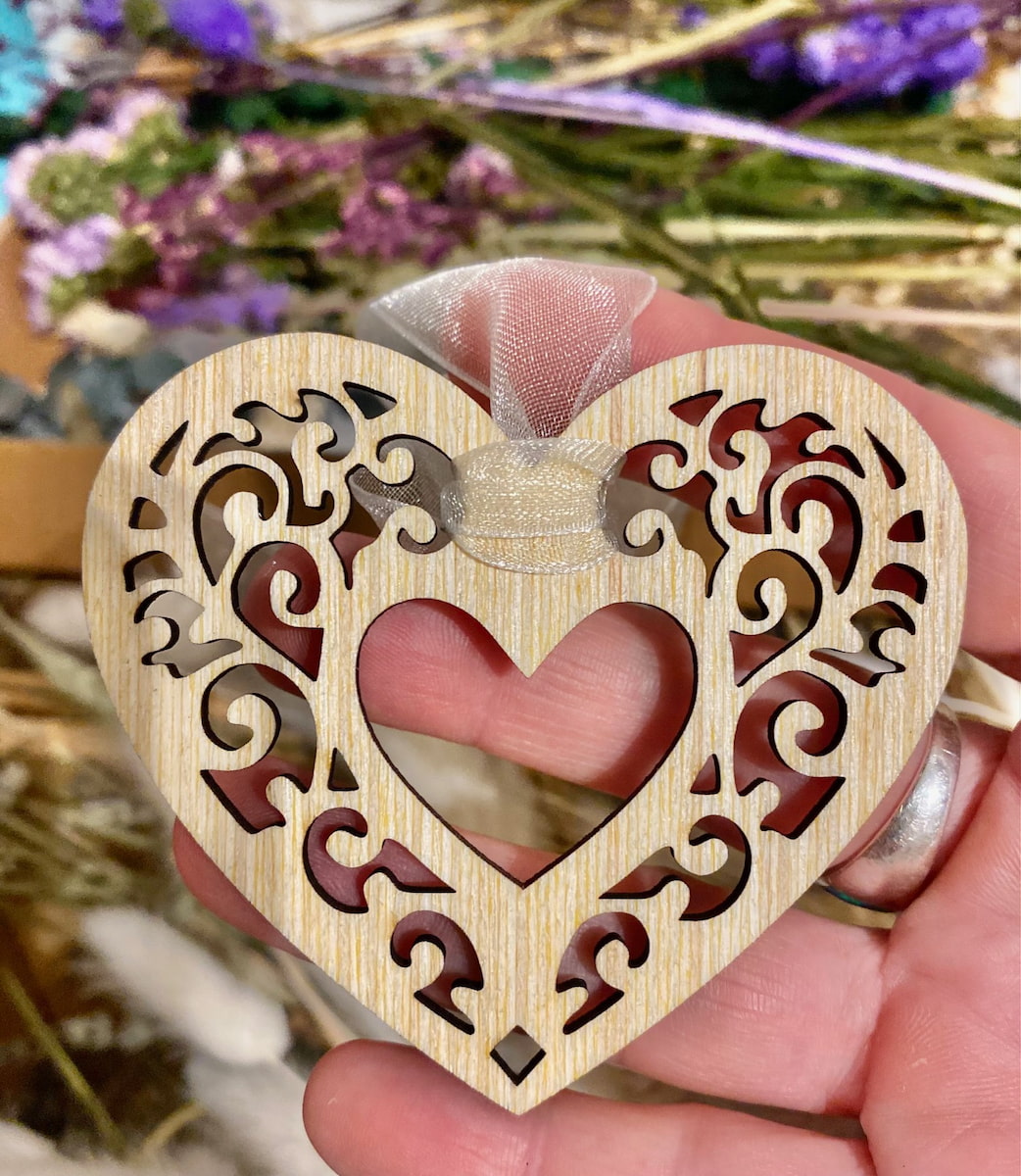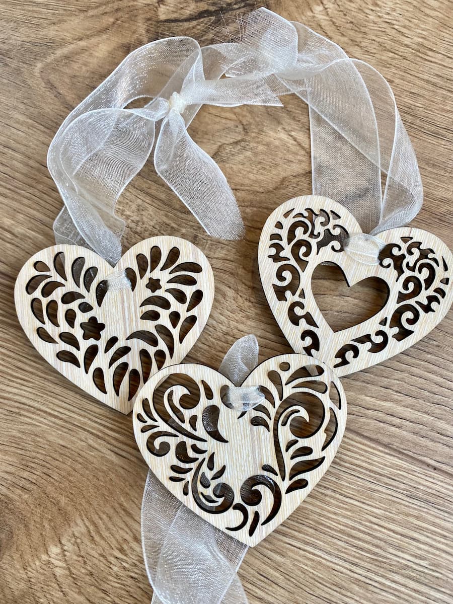 Finement découpé de jolis motifs, comme une dentelle naturelle, chaque cœur est orné d'un ruban pour suspendre sur une poignée, un mur, une branche ou dans le sapin de Noël (dimension 7 cm x 7 cm).