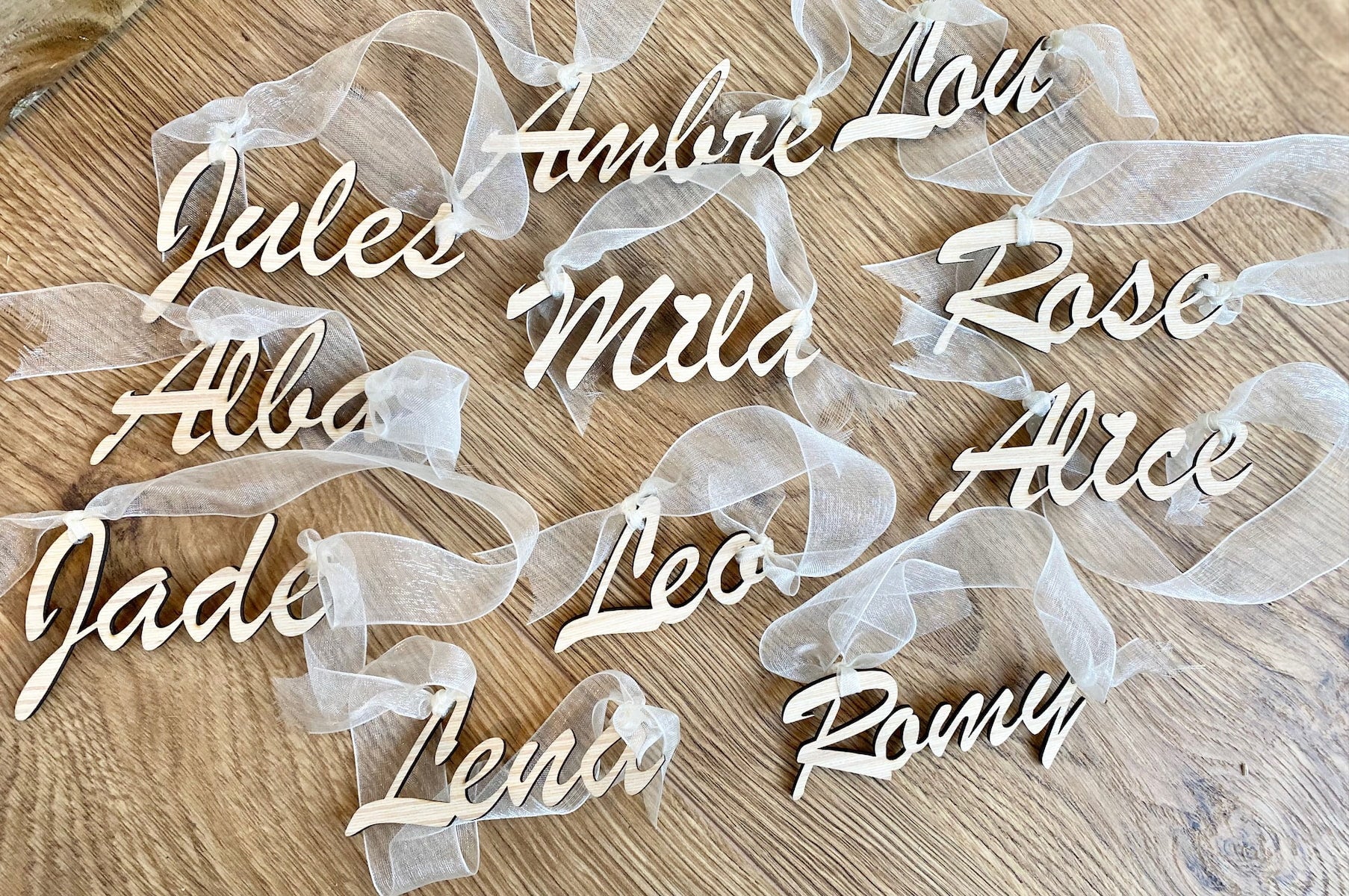 Prénom seul suspendu par un nœud léger : naturel et plein de charme, ce prénom en bois découpé est à suspendre pour personnalité la porte d'une chambre d'enfant, le sapin ou un coin particulier de la maison.