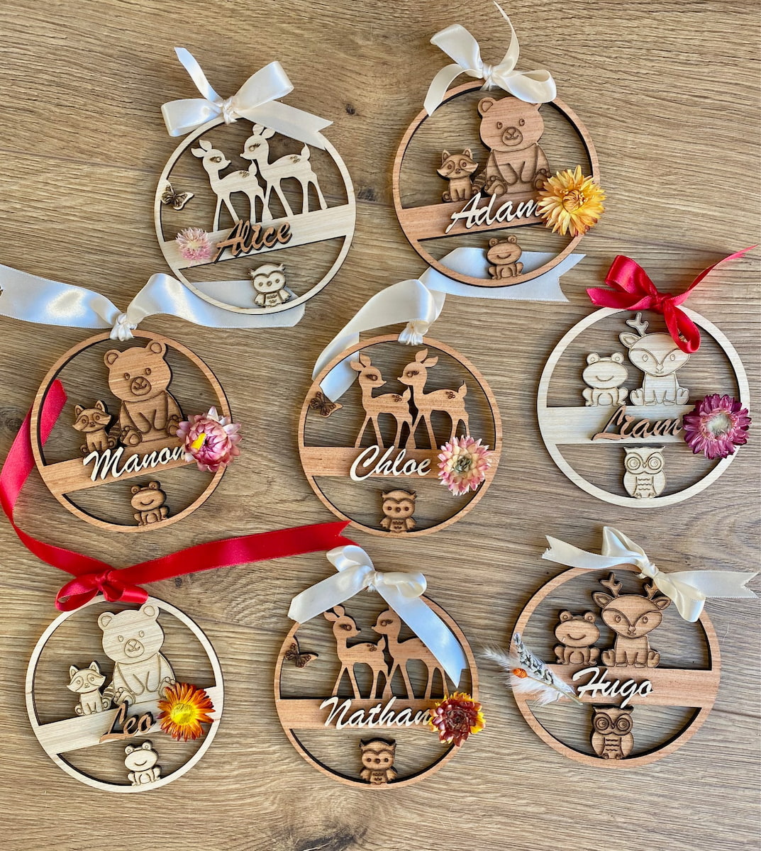 Boules prénoms en bois personnalisables : découpés dans le bois, chaque pièce met en scène de petits animaux choisi pour leur tendresse avec un prénom découpé et collé en relief qui rend cette décoration encore plus personnelle. Un joli ruban pour suspendre au sapin, dans une chambre d'enfant, ou sur la porte. Parfait aussi pour célébrer une naissance ou un baptême.