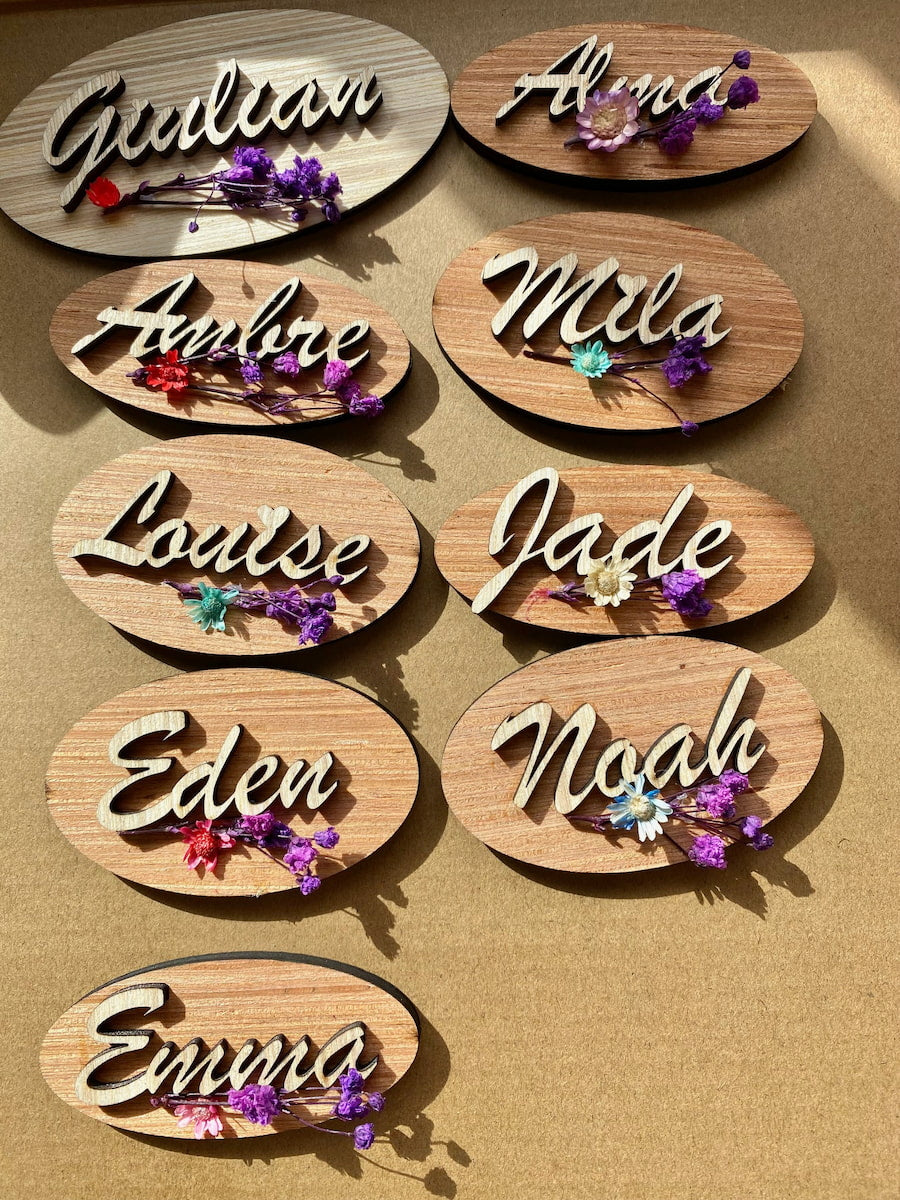 Prénom sur socle bois : cette objet personnalisable est découpé dans le bois, orné de fleurs séchées naturelles, un mélange fragile et chaleureux. Une touche simple et élégante pour une chambre, un bureau ou une table de fête.